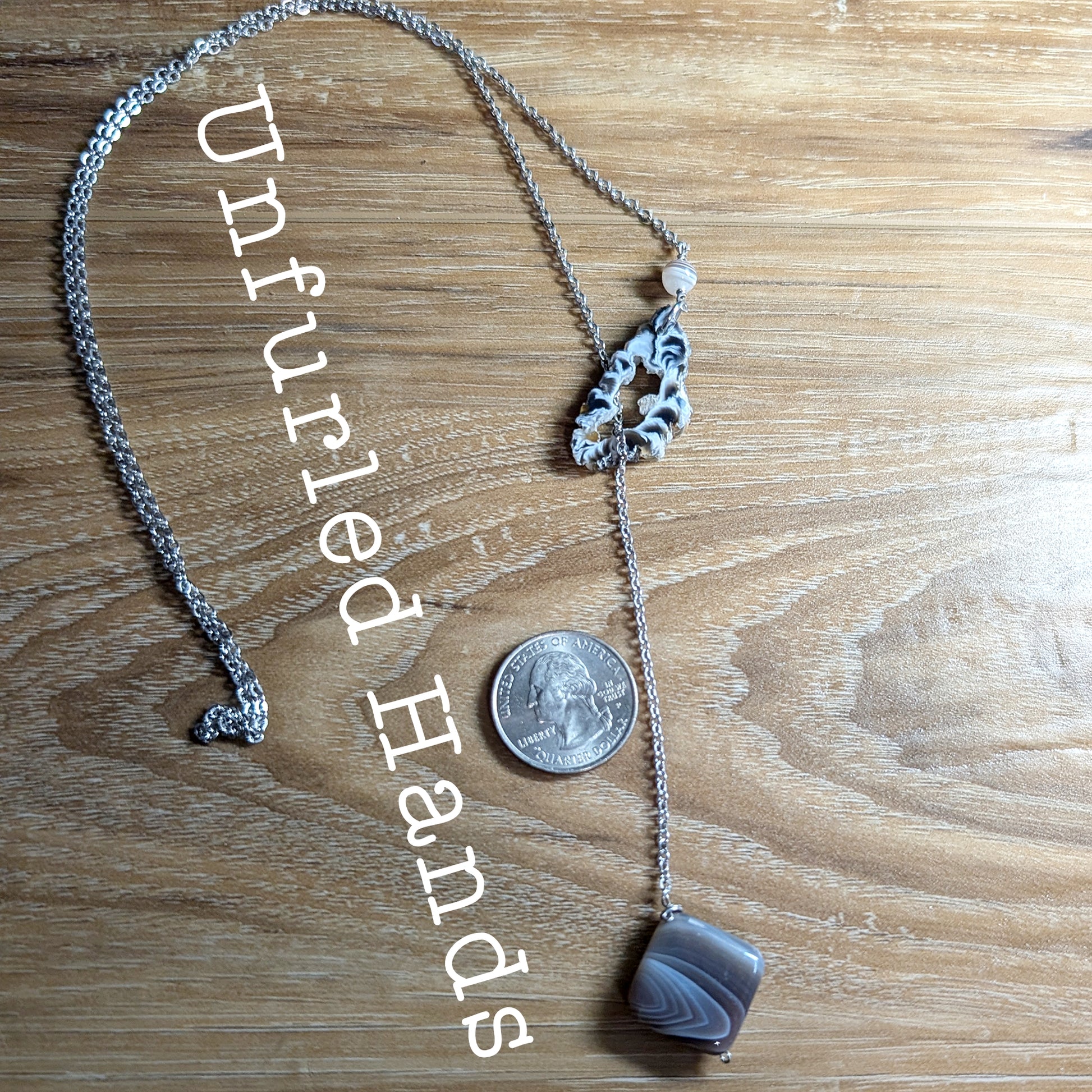 This unique, one of a kind Lariat Y necklace features a rich, banded Agate hanging from a Geo slice. Features rich, smokey colors of brown and some grays and creams. All accented with Stainless Steel wire and chain.